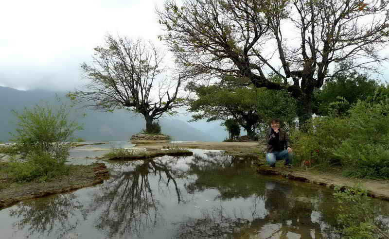 白水台位于中甸县东南101公里处。海拔约有2380米,其造型酷似一层层梯田。成因是由于水中的碳酸氢钙经太阳光照射,水分蒸发后形成碳酸钙白色沉积物,之后又不断覆盖地表而形成的泉华地,因此是中国最大的泉水台地之一。占地面积3平方公里,属温带气候,降雨较多,年平均气温为11.4℃。这里是中国纳西民族文化的发祥地之一。 |