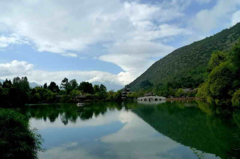 丽江黑龙潭又名玉泉公园,位于城北象山脚下,从古城四方街沿经纬纵横的玉河溯流而上,约行一公里有一处晶莹清澈的泉潭,即为中外闻名的黑龙潭。潭水从石缝间涌涌喷出,依山斛清泉汇成四万平方米潭面。四周山清水秀,柳暗花明。依山傍水造型优美的古建筑点缀其间。其流韵溢彩,常引人驻足留连。 |
