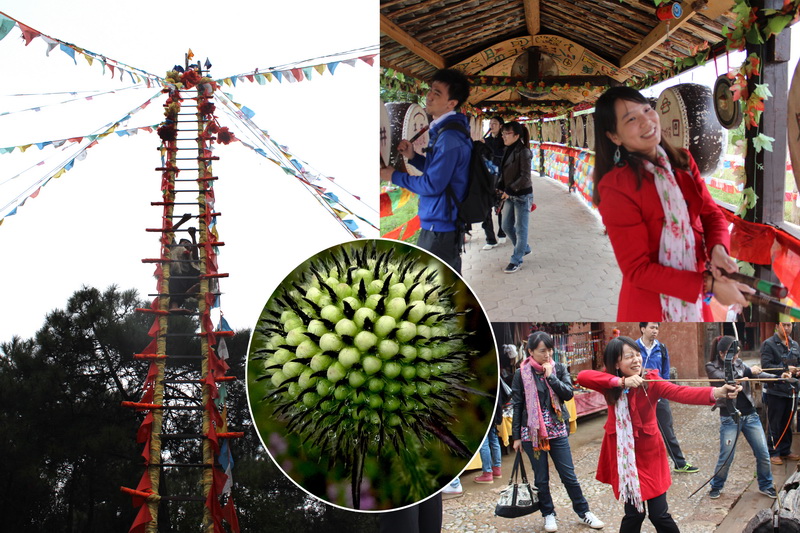 东巴文化是纳西族民族文化的重要内容之一。主指纳西族古代文化,因保存于东巴教而得名,已有1000多年的历史。主要包括东巴文、东巴经、东巴画、东巴乐、东巴舞、东巴法器和各种祭祀仪式等。妈呀!有人上刀山!!胖金哥胖金妹们正在击鼓许愿呢!!看胖金妹的的架势多么的优雅。 |