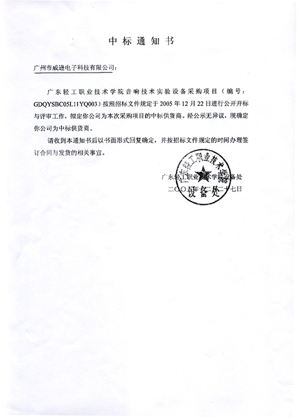 我司中标广东轻工职业技术学院音响技术实验设备采购项目