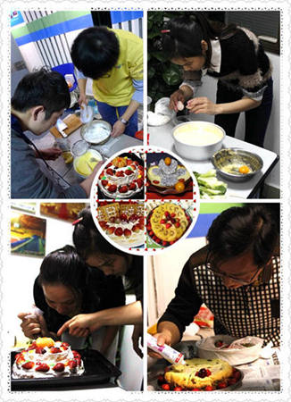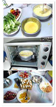 而蛋糕制作的比拼也在如火如荼的进行着!瞧,“先锋队”和“七星队”轻松的用电动打蛋器打发蛋白,而我们的“男神队”和“嗨翻天队”虽无专业工具,但不甘示弱,他们用强劲的手臂挥舞着筷子和手动打蛋器打蛋白。电饭锅为现场制作蛋糕的主要设备,“先锋队”为了制作更美味的蛋糕,把全套制作蛋糕的工具带上战场。专业的烤箱似乎从硬件上略胜一筹,烘烤的蛋糕香气四溢。可我们比拼的不只是味道,还有外观和创意。因此,蛋糕胚出炉后装饰也不能有一丝马虎。草莓、提子、橘子、芒果、火龙果、圣女果、奇异果……各式水果搭配刺激着我们的味蕾。