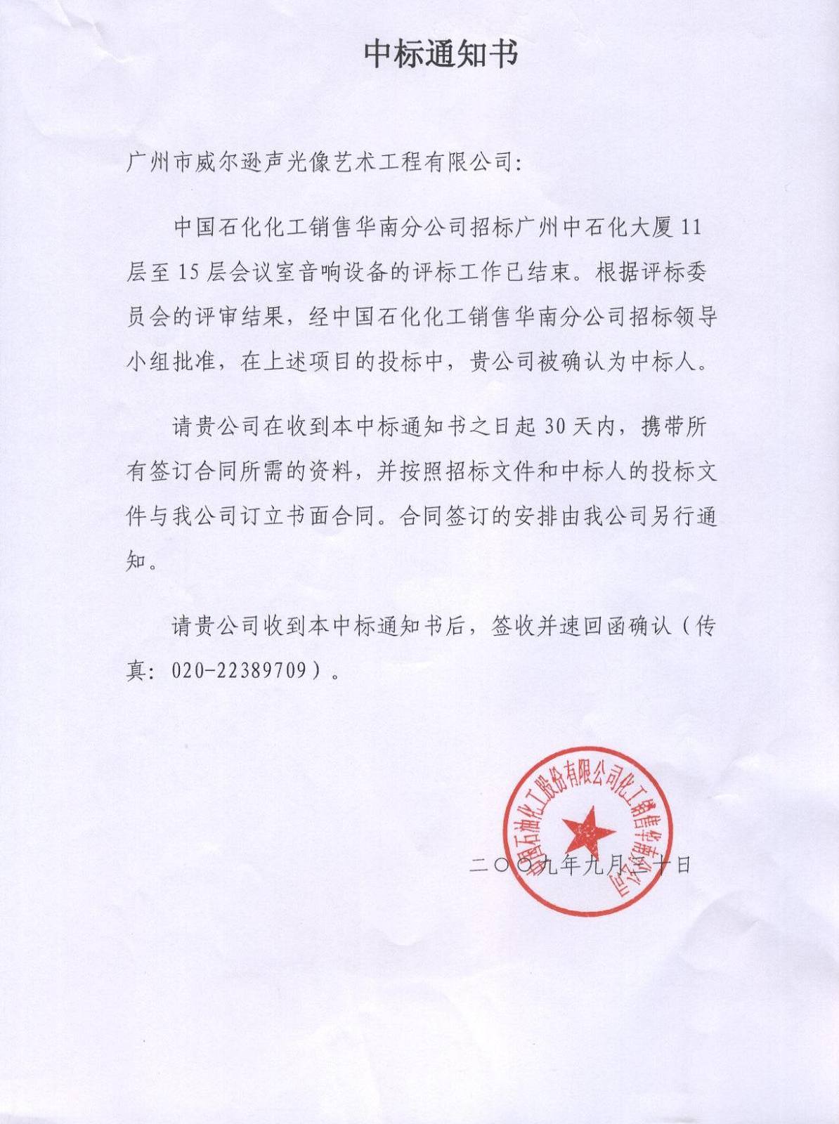 热烈祝贺我司于2009年9月30日中标“广州中石化大厦A座11-15层会议室音响设备采购及相关安装服务项目”。
